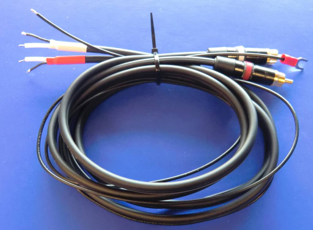 Phonokabel in 120cm Länge. Innenleiter aus 5N/6N OFC. RCA/Cinch-Stecker mit rhodinierten Kontakten. Massekabel mit 2 Kabelschuhen aus Vorführung. 299.-EUR 199.-EUR (noch 1 Stück)
